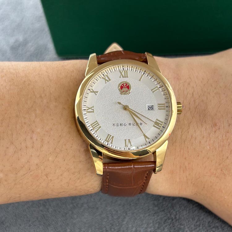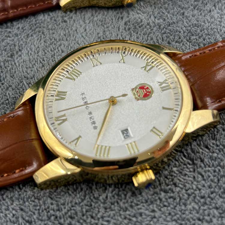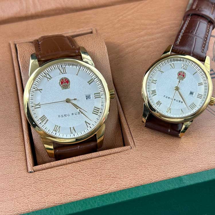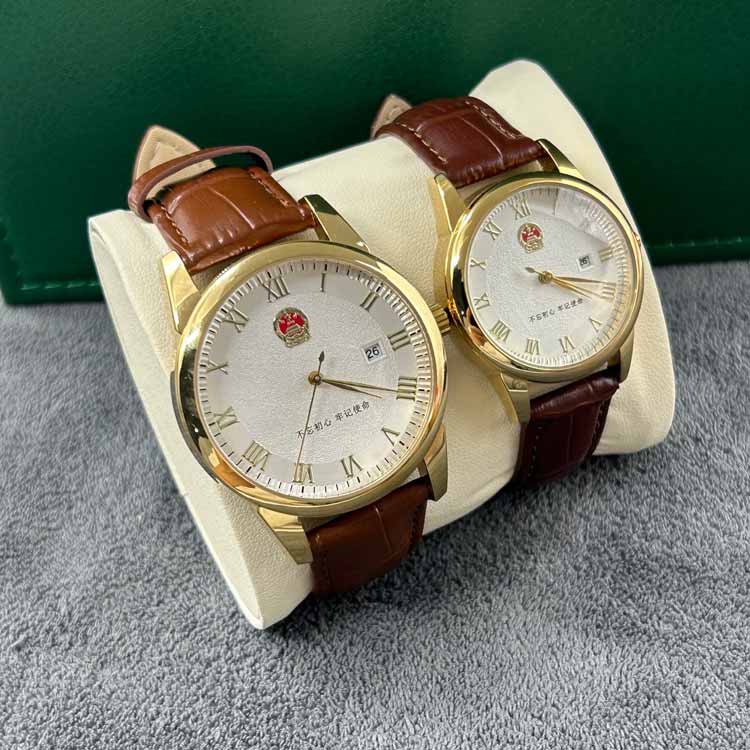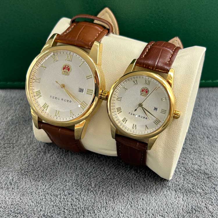 男女情侣表棕色小牛皮表带8058党徽不忘初心金色表盘框情侣款